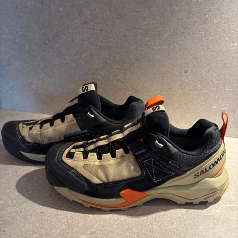 Salomon Alphacross 3 GTX tursko i størrelse 40 for dame. Skoene er svarte og har Gore-Tex-membran som gjør dem vanntette og pustende. Overdelen er i syntetisk materiale/tekstil med tradisjonell snøring. Yttersålen har grovt mønster tilpasset fottur og bruk på variert underlag. Innersålen er Ortholite for økt komfort. Egner seg til fotturer og annen utendørs bruk.