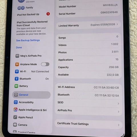iPaden fungerer som den skal og er pent brukt. Skjermen er stor – perfekt til multitasking, tegning, video og lesing. Apple Pencil følger med, men tror batteriet har sluttet å funke.