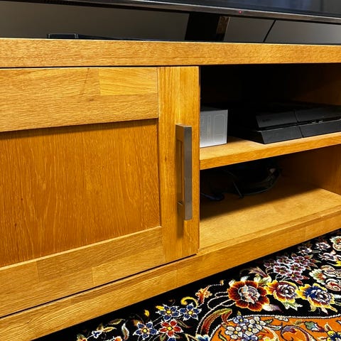 TV-benk i tre i lys brun utførelse. Benken har rektangulær form med tre seksjoner, hvor midtseksjonen har åpen hylle og skuff under. Frontene har mønsterlagt finer i fiskebens- eller chevronstil. Topplaten er glatt og har gjennomføring for kabler bak. Egnet som TV-møbel eller lav oppbevaringsbenk i stue, med plass til medieutstyr og mindre gjenstander i skuff og bak dører. Har to små hakk på toppen, kan evt fikses eller bytte ut toppen som ikke koster så mye på IKEA. Vi kjøpte den ny for ca 2 år siden.