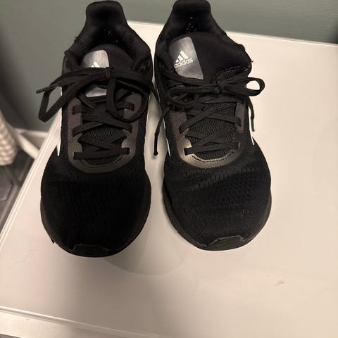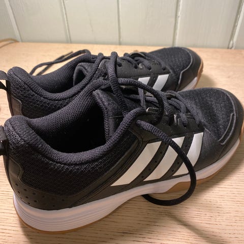Adidas joggesko for barn, unisex, i størrelse 37. 1/2. Skoene er gule med sorte lisser og karakteristiske Adidas-striper på siden. Overdelen består av tekstil og syntetisk materiale, med polstret kant rundt ankelen for økt komfort. Yttersålen er i gummi med mønster for grep. Egnet som hverdagssko eller til lett aktivitet for barn i størrelse 37 1/2