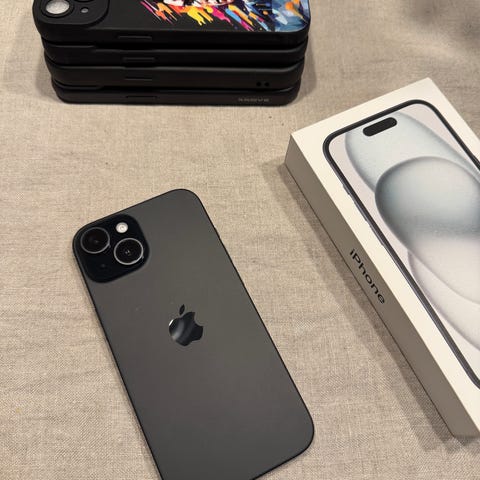 Apple iPhone 13 mobiltelefon med 128 GB lagringskapasitet. Modellen har dobbelttkamera på baksiden og frontskjerm som dekker nesten hele forsiden. Farge sort.