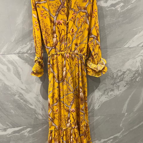 Kjolen har lange ermer, V-hals og markert midje med smock som gir fin passform. Lett og behagelig stoff som faller pent, perfekt både til hverdags og pyntede anledninger.