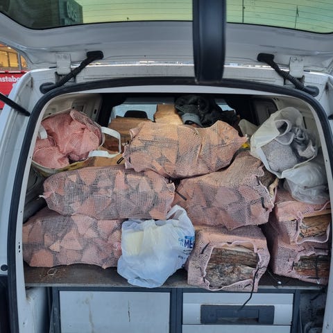 Tørr bjørkeved, pose fra IKEA, ca. 100 liter. 200 kr. per pose.