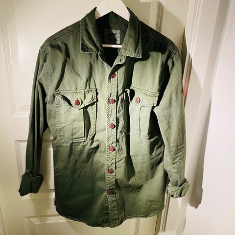 Pent brukt, ingen bruksmerker. Den har lange ermer, krage og knappelukking foran. To brystlommer med klaff og knapp.