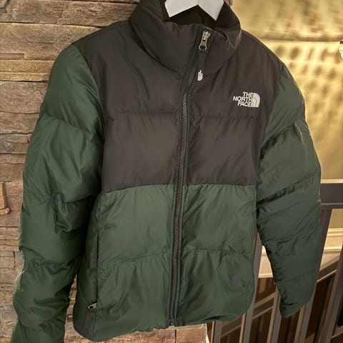 The North Face dunjakke for dame i størrelse XS. Jakken er brun og fylt med dun, noe som gir god isolasjon. Kort modell med høy krage og glidelås foran. Egnet som ytterjakke i kaldt vær og til hverdagsbruk utendørs. Nypris 4000kr. Selges for 1000kr. Brukt to sesonger, noen minihull, som ikke synes!