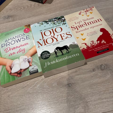 Blandet bokpakker med romaner fra flere ulike forfattere. Bildene viser blant annet bøker av Nora Roberts, Jojo Moyes, Lucinda Riley, Debbie Macomber, Elizabeth George, Helga Flatland og andre. Pakkene inneholder både pocket- og innbundne bøker innen sjangre som roman, feelgood, krim og drama. Egner seg for lesere som ønsker en variert samling skjønnlitteratur fra kjente forfatternavn. Antall bøker og eksakte titler fremgår av bildene.