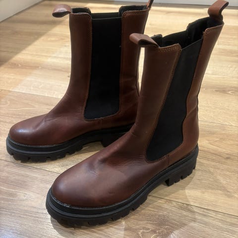 Stockholm Design Group støvler i størrelse 40. Ankelhøye støvler i brun farge med preget overflate og kraftig yttersåle med grovt mønster. Elastiske felt i sidene for enklere av- og påtaking og hempe bak på skaftet. Egnet til hverdagsbruk i ulike værforhold.