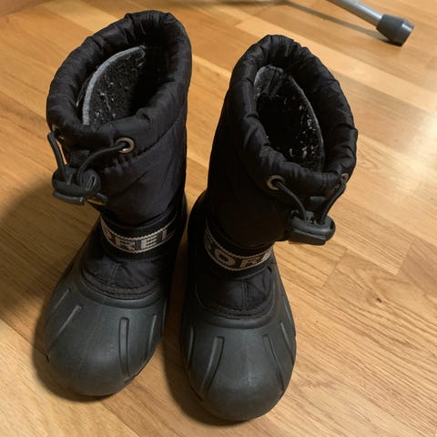 Sorel vintersko for barn i størrelse 29,5 unisex-modell. Skoene er svarte med kraftig gummisåle og nedre del i gummi for ekstra beskyttelse mot fukt. Overdelen er i tekstil med snølås og stramming øverst, samt justerbar rem over vristen for bedre passform. Innvendig er skoene fôret for varme og komfort i kaldt vær. Man kan ta ut innersko og tørke på varmekabler over natta. Egnet som vinter- og snøstøvler til allsidig bruk ute i kulde og snø.