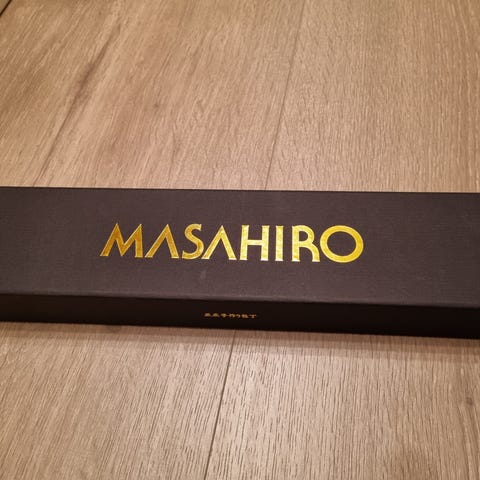 Kniven er ny/ubrukt og ligger fortsatt i esken med pappbeskyttelsen rundt knivbladet og originalesken fra Masahiro.