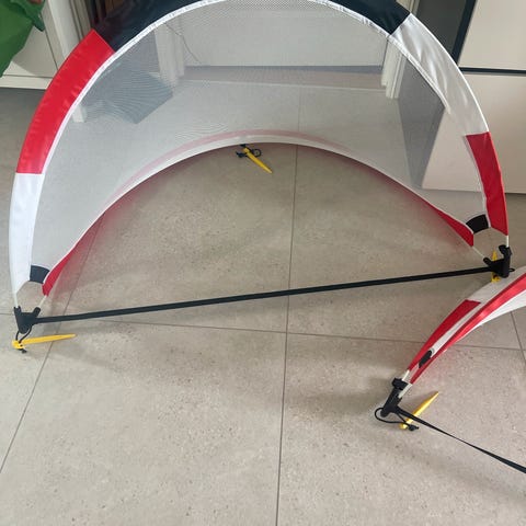 Fotballmål med skuddduk i svart og hvit. Målet har integrert nett og en frontduk med motiv av keeper og utskårne hull til presisjonsskyting. Egnet til fotballtrening innendørs eller lek i hage. Sammenleggbart og lett å flytte og oppbevare.