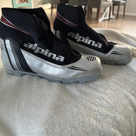 Alpina langrennsstøvler i størrelse 44. Modellen er beregnet for klassisk langrenn og har overtrekk med glidelås foran for å beskytte mot snø og fukt. Yttermateriale i sølvfarget syntetisk materiale kombinert med svart tekstil. Såle tilpasset langrennsbindinger (se bilder for detaljert såletype). Passer til bruk på langrennsturer og trening på ski.