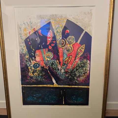 Totalt ukjent kunstner for meg! I følge dokumentasjon jeg fikk med så heter han Sean Eble. En dag blir han nok berømt og da vil den heldige eier av dette smøreriet her på ca. 50 x 70 cm kunne le hele veien til banken. Jeg ønsker en del av kaka og legger det derfor ut til den sympatiske sum av kr. 990,- Det er ikke mer enn det lerret, pensel og oljemaling koster i innkjøp hvis du ønsker å smøre ut noe slik selv en kveld du kjeder deg 😉