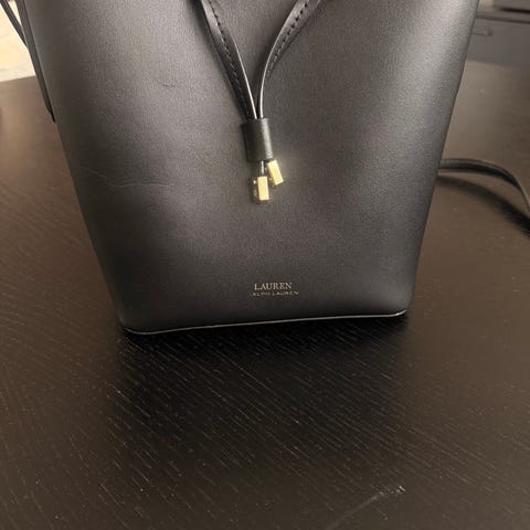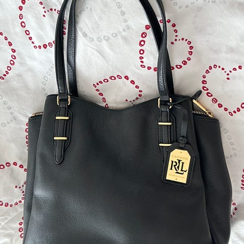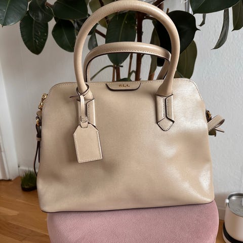 Ralph Lauren skinnveske for dame. Vesken er laget i lær og har doble hanker samt avtagbar skulderrem. Innvendig er den inndelt i flere rom, inkludert glidelåslomme og åpne lommer for organisering av innhold. Bunnen har metallføtter som beskytter vesken ved plassering på underlag. Passer til daglig bruk og til å bære personlige eiendeler som lommebok, nøkler, mobil og småting.