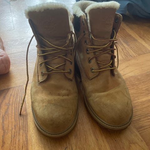 Timberland vinterstøvler i størrelse 40. Klassiske brune skinnstøvler med snøring og kraftig gummisåle med grovt mønster. Polstret ankelparti for økt komfort. Egnet som robuste hverdagssko og til bruk i kaldere værforhold.