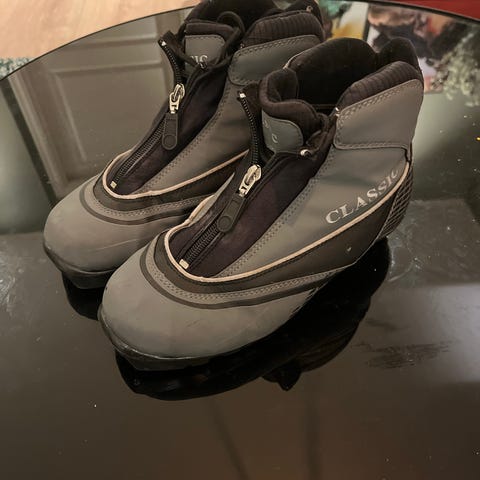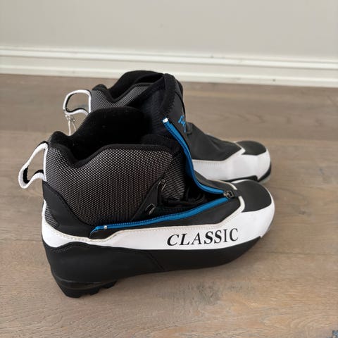 Classic langrennsstøvler/skisko, størrelse 40, i svart med røde og hvite detaljer. Støvlene har snøring foran og kraftig såle med godt mønster for bruk med standard langrennsbindinger.