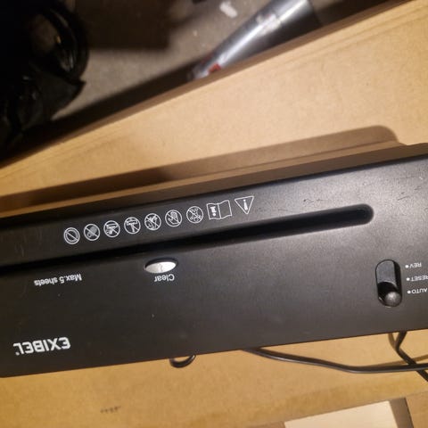 Makuleringsmaskin selges, kun brukt en gang eller to. Merke Exibel, tar 10 ark av gangen + følger med en pakke «smørepapir» til vedlikehold.