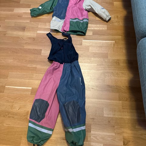 Regnsettet er like helt, men med noe synlig slitasje på knær/refleks på benet + at det mangler strikk på høyre ben.