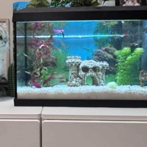 Akvariet var nytt i mars 2020. Det har vært i bruke hele tiden, og er fremdeles i bruk. Akvariet fremstår i god stand. Tilsvarende akvariet med møbel har i dag en nypris på ca 7 500,-.