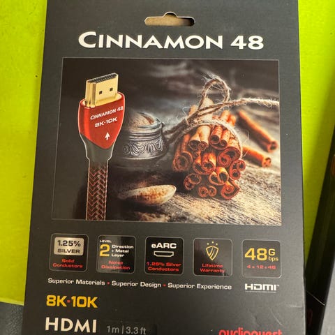HDMI-kabel beregnet for tilkobling mellom for eksempel TV, projektor, spillkonsoll og andre HDMI-enheter. Kabelen støtter 8K/10K-oppløsning og er merket med 48 Gbps båndbredde. Lengden på kabelen er 3 meter. Modellen er en del av AudioQuest sin Cinnamon 48-serie, og er laget for bruk med moderne lyd- og bildeutstyr som krever høy dataoverføring via HDMI.