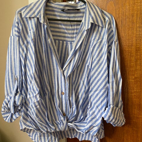 H&M skjorte for dame i størrelse M. Skjorten er i blått bomullsstoff med rutemønster og korte ermer. Modellen har krage og knepping foran. Egnet til hverdagsbruk og kan kombineres med både bukser og skjørt.
