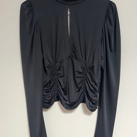 H&M genser for dame i størrelse L. Genseren er svart og laget av polyester. Modellen har lange ermer og cropped passform, med snøring og rynkedetaljer foran. Passer til hverdagsbruk eller som del av et enkelt antrekk sammen med bukse eller skjørt.