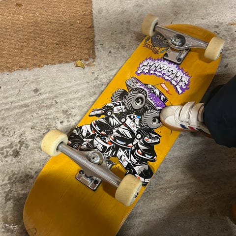 Globe skateboard med grafisk motiv på undersiden og sort grip tape på oversiden. Brettet er utstyrt med Tensor trucks og gule Globe-hjul. Passer til vanlig skatebruk i park eller gate. Designet har tydelige gule og svarte detaljer med illustrasjon av hodeskalle og sopper på undersiden.