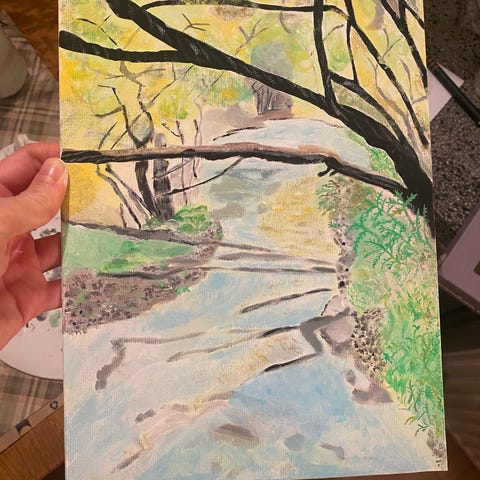 Maleri som viser et grønt landskap med trær, busker og blomster rundt en dam. I bakgrunnen er det en liten bro over vannet. Fargene domineres av grønn-, blå-, lilla- og rosatoner. Bildet er malt på lerret og kan henges direkte på vegg. Passer som veggdekor i stue, soverom eller andre oppholdsrom.