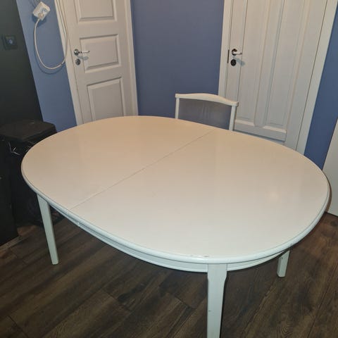 Bordet har oval bordplate i mørkbeiset treverk og understell i hvit. Uttrekksfunksjon med midtdel gjør at bordet kan forlenges ved behov. Egnet som spisebord på kjøkken eller i spisestue. Merk at de to illeggsplatene som medfølger ikke er beiset i samme farge og at bordet har noen merker. Stolene medfølger dessverre ikke.