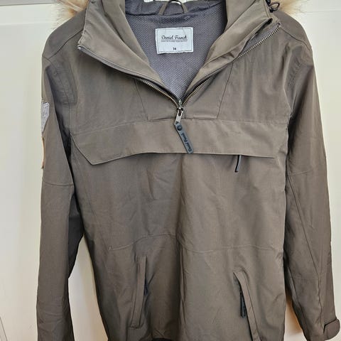Daniel franck anorakk str 38, knapt brukt, str 38. Fin rødfarge og med fuskepels kant på hette. 10 000mm regnsøyle.