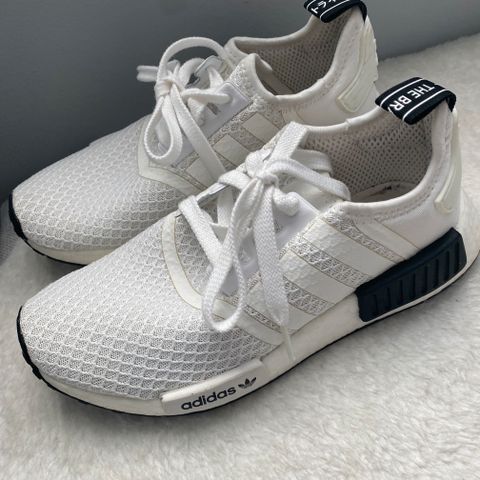 Adidas NMD R1 primeknit Japan Triple White sneakers i størrelse 43 1/3. Svært sjelden modell, limited edition og selges ikke lengre. Bruksmerker som vist på bilder, men fortsatt svært fine sko. God kvalitet på såler.