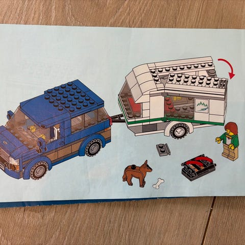 LEGO City lekesett. Inneholder en liten bil, en campingvogn og minifigurer. Passer til lek og bygging med andre LEGO City-sett.