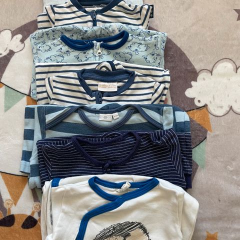 Klespakke med flere langermede body’er i ulike flerfargede varianter i str 56. 26 body’er, hvorav 8 av de er omslagsbody’er. I tillegg følger 4 T-skjortebody’er også med.