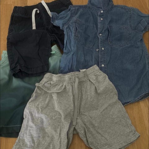 Klespakke i størrelse 104, 3 shortser, 1 T-skjorte og en penskjorte. Penskjorten er ny og ubrukt, de andre er blitt brukt før :)