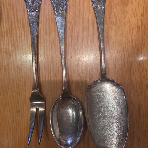 6 stk dessertgafler og skjeer + syltetøyskje sølvplett