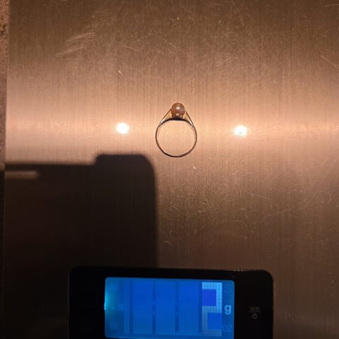 Gull anheng, og antar stenen er krystall eller sånn. veier 2 gr på kjøkkenvekt og merket 585