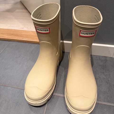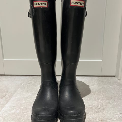 Hunter regnstøvler i størrelse 39. Høye, svarte støvler i gummi med justerbar rem øverst på skaftet. Klassisk modell med profilert yttersåle for bedre grep på vått underlag. Passer til bruk i regnvær og generelt fuktige forhold.