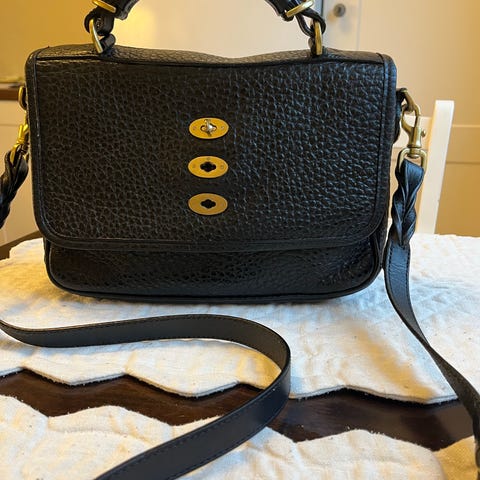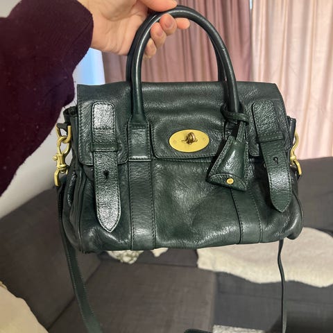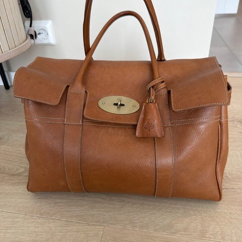 Mulberry skinnveske for dame. Vesken er laget i lær med strukturert overflate og har topphåndtak. Lukkes med karakteristisk vrilås i metall på fronten. Passer som hverdagsveske eller jobbveske med plass til personlige eiendeler og mindre tilbehør. En ikonisk veske som er en klassiker. Den er pent brukt, men har noe slitasje i ytterkant av undersiden, men ellers i fin stand. Er litt ufasong etter at den har ligget i dustbag over tid, så anbefaler å oppbevare den med veskeinnlegg for å bevare formen på den.