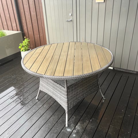 8 stoler med regulerbar rygg og lyse puter. Kan klappes sammen for praktisk oppbevaring.