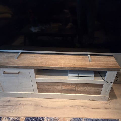 Reol i mørk brunt. Kan brukes samlet eller deles opp i 3 deler. Brukt som bok reol med tv i midten hos oss.