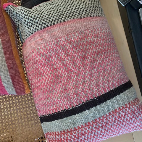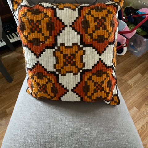 Kelim pyntepute i flerfarget mønster. Trekk med vevd struktur i varme fargetoner og glidelås som gjør det enkelt å ta av og på trekket. Passer som dekorativ pute i sofa, stol eller på seng. Innleggspute følger med etter bildene, men mål og materialer er ikke oppgitt.
