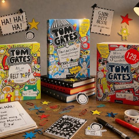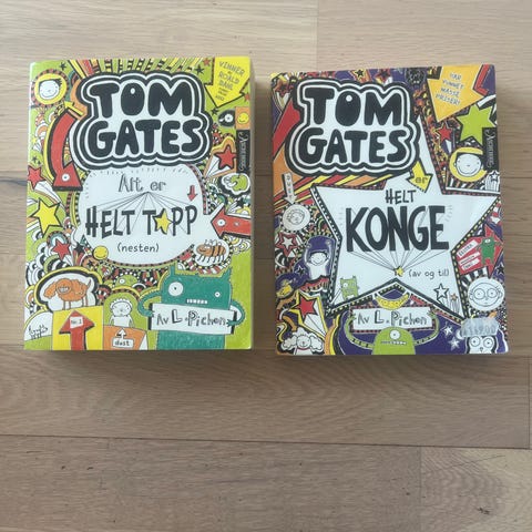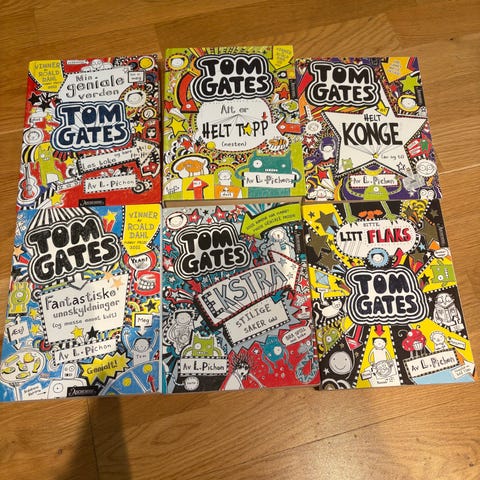 Tom Gates bokserie barnebøker med norsk tekst. Bøkene har illustrerte sider med kombinasjon av tekst og tegninger, typisk for humoristiske barnebøker i dagbokstil. Innbundet format med fargerike omslag. Egner seg for barn som leser selv, og kan også brukes til høytlesning. Innholdet består av korte kapitler, illustrasjoner og håndskrift-lignende typografi som kan gjøre lesingen mer oversiktlig for yngre lesere. 240 kr for alle eller 40 for en