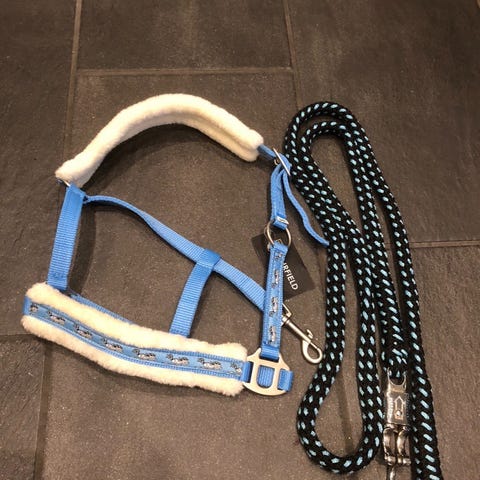 Horze Arturo grime med leietau i størrelse full. Grimen er laget i nylongjord med stripemønster i lilla og hvitt, og har metallspenner og ringer for justering. Leveres med matchende leietau i samme farger.