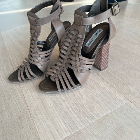 Steve Madden hæler i størrelse 38. Skoene har åpen tå, tynn hæl og ankelrem. Overdelen har leopardmønster i brune og svarte toner. Passer som pene sko til ulike anledninger der man ønsker hæler med mønster. Skoene er aldri brukt, kun forsøkt på.
