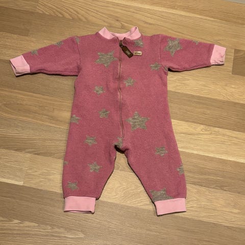 Kivat ulldress for barn i størrelse 86. Dressen er i brun ull med mønster og hel glidelås foran. Modellen er unisex og har ribbede mansjetter ved ermer og ben for bedre passform. Egner seg som varm og myk heldress til hverdagsbruk og utelek i kjøligere vær.