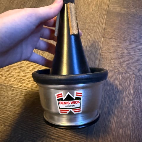 Best Brass practice mute i aluminium. Demperen er konstruert for bruk med trompet og gir redusert lydvolum ved øving eller spilling i mindre rom. Formen er kompakt, og materialene gjør den lett og enkel å håndtere. Passer i klokketuten på en standard trompet eller kornett