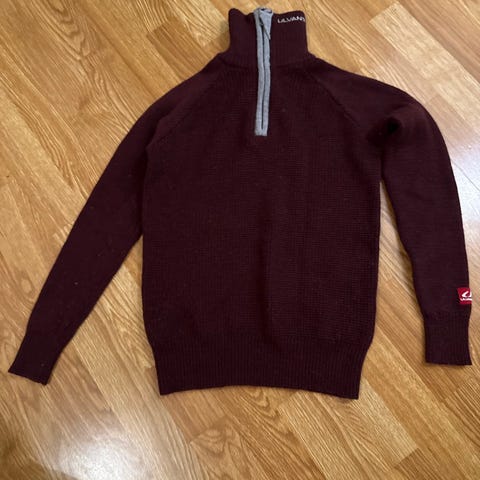 Ulvang ullgenser for barn i størrelse 140. Modellen har høy hals med glidelås og ribbestrikket struktur. Egnet som mellomlag. Det er satt på et speidermerke på armen, men det ser ut som det er mulig å fjerne.