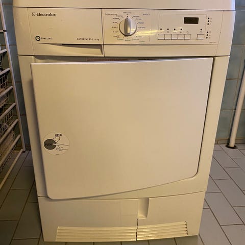 Tørketrommelen fulgte med leiligheten da vi overtok i 2020. Den har vært lite brukt og fungerer som den skal.