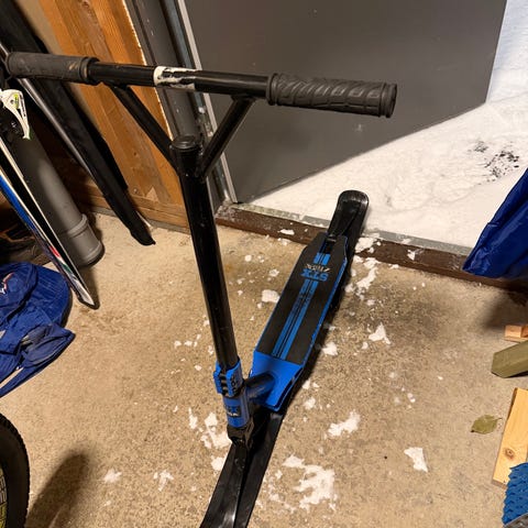 Stiga Snow Kick snøsparkesykkel i blå og svart. Modellen har styre med T-form, ståbrett med antiskli-belegg og bredt plastbrett/skinne i stedet for hjul for bruk på snø. Egnet for barn som vil bruke sparkesykkel på vinterføre, for eksempel i bakker eller på hardpakket snø. Justerbart styre kan gi tilpasning til brukerens høyde, avhengig av modellvariant.