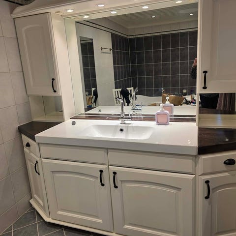 Baderomsinnredning i bjerk natur lakkert, består av 8 skap, 11 dører og 3 skuffer. Speilet følger ikke med. Benkeplate med to forskjellige servanter, to blandebatterier samt komplett dusjbatteri. Alt er demontert. Selges samlet.
