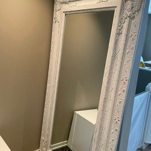 Bohus speil i helfigur med hvit, ornamentert ramme. Speilet har rektangulær form og er utstyrt med dekorative detaljer øverst på rammen. Egner seg godt i gang, soverom eller garderobe for helfigurspeiling og som veggdekorasjon.
